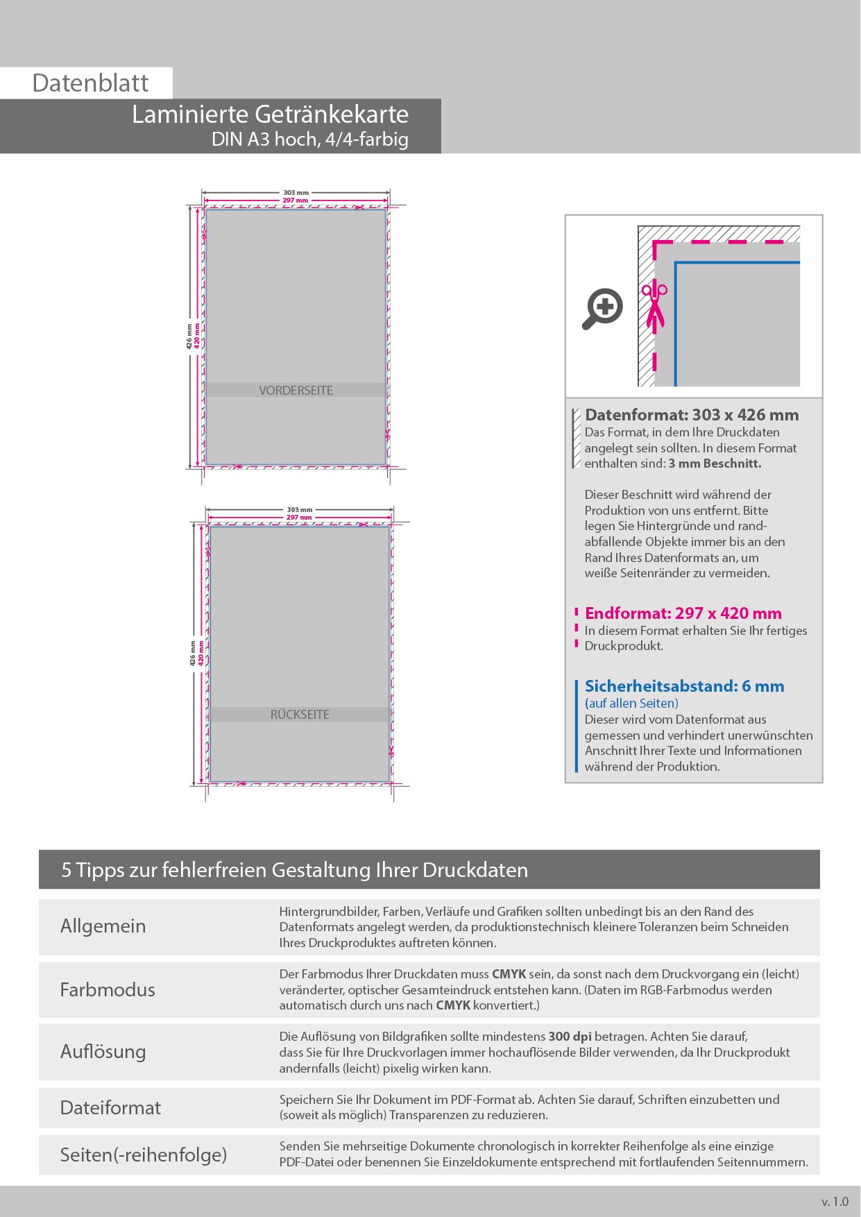 Laminierte Getränkekarte DIN A3 (29,7 cm x 42,0 cm), beidseitig bedruckt